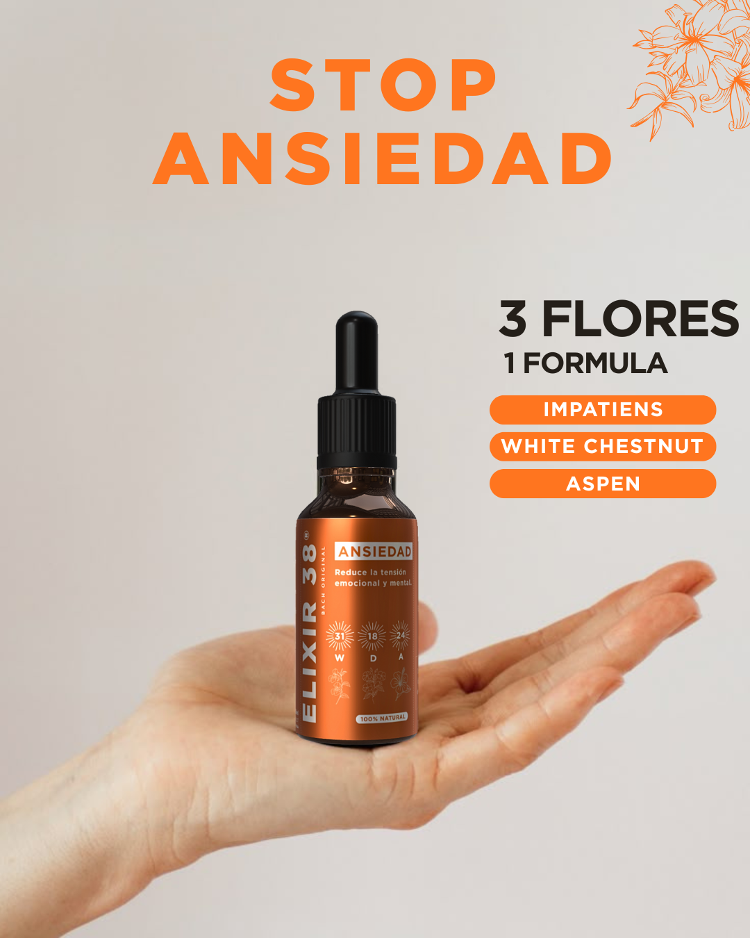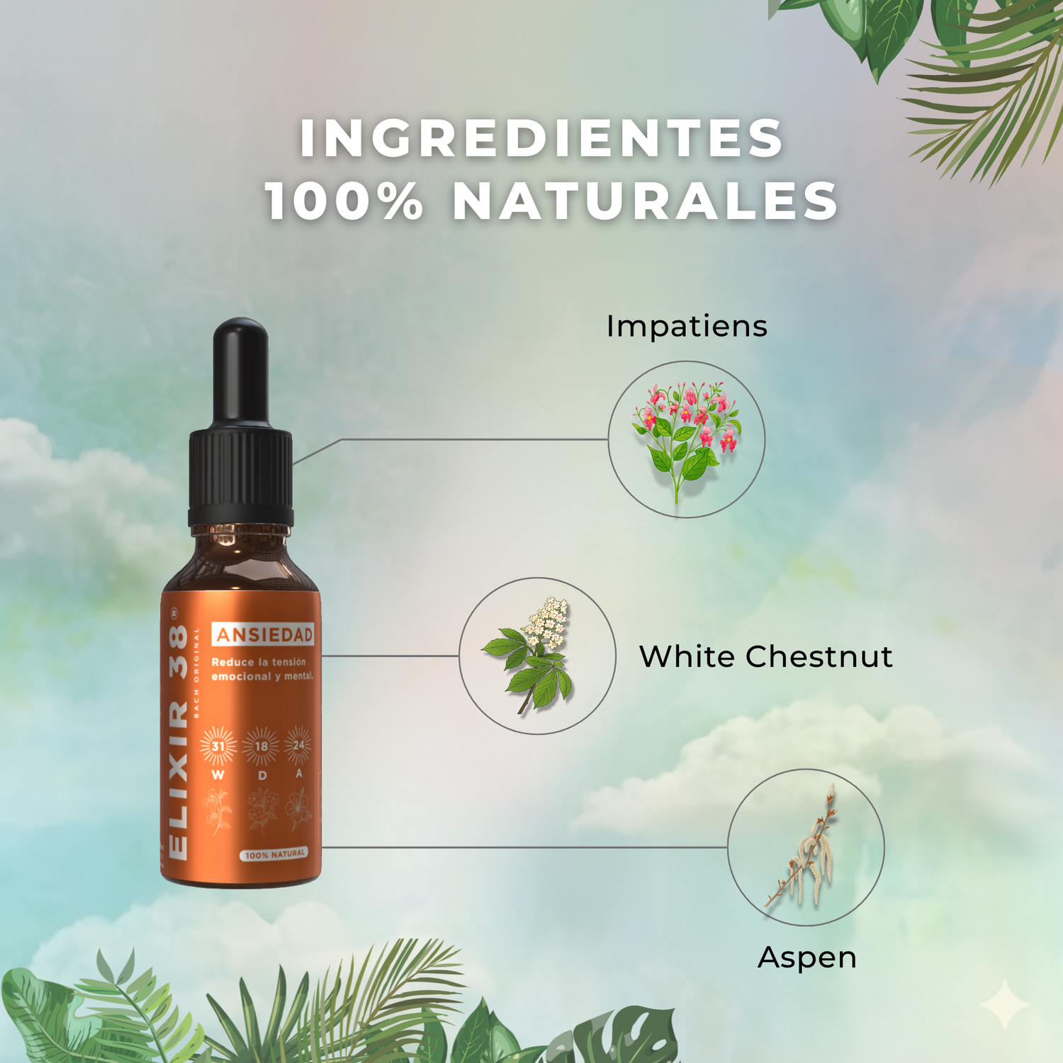 Calmá tu mente con ELIXIR38, la fórmula natural con Flores de Bach que ayuda a reducir la ansiedad y recuperar el equilibrio interior.