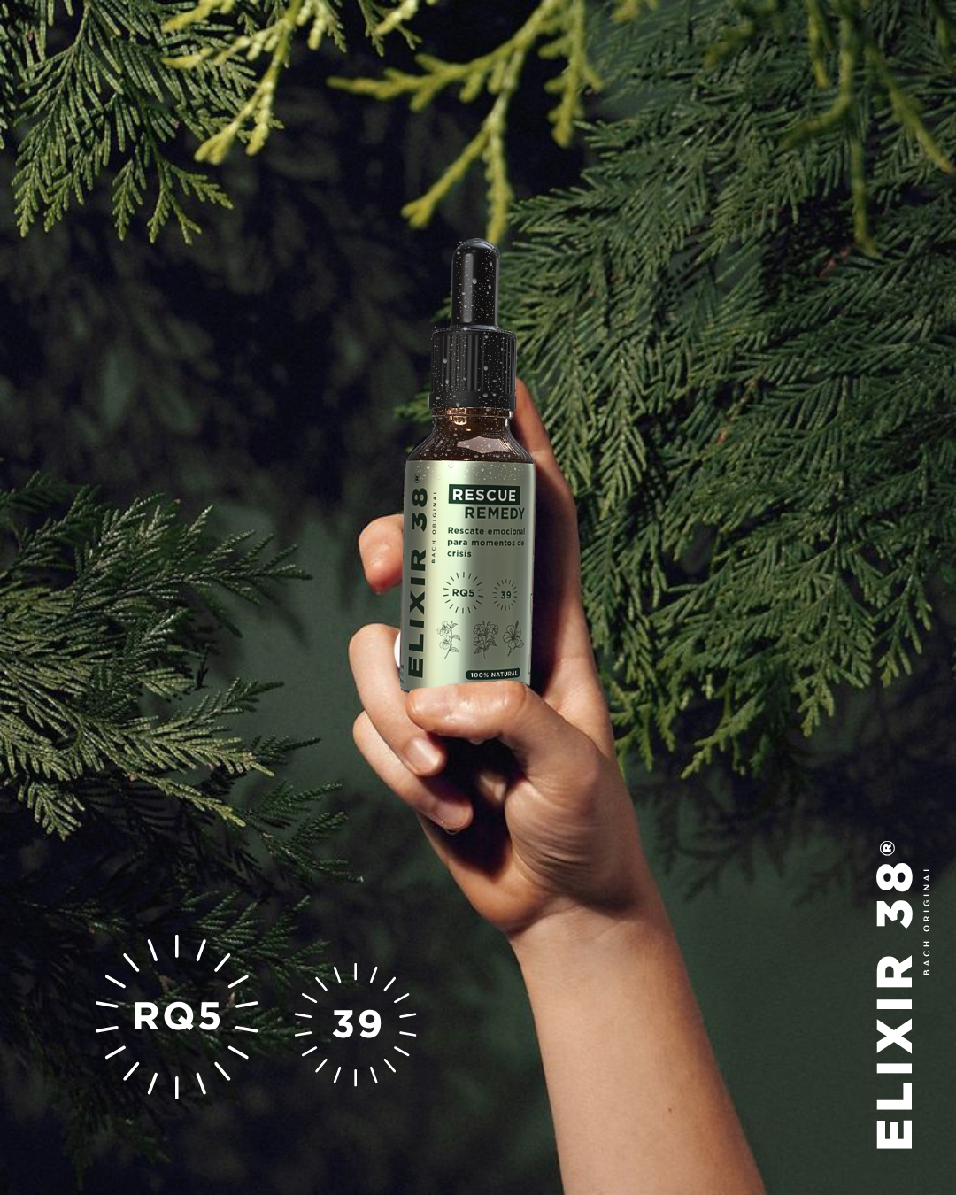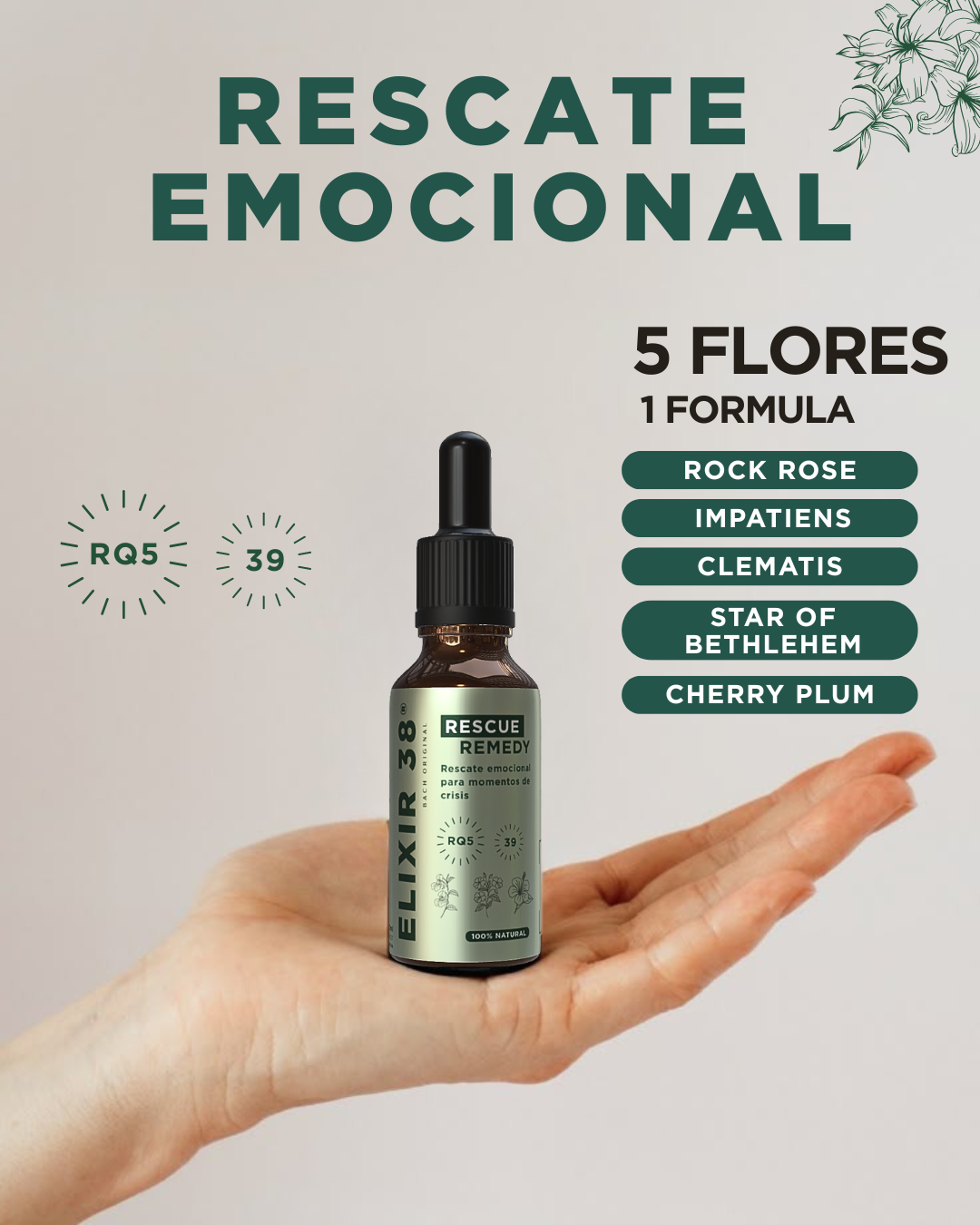 Fórmula de 5 flores esenciales creada para acompañarte en momentos de crisis, angustia o desborde emocional.